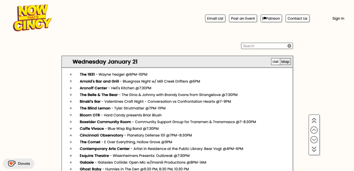 Another news venture is a website called Now That’s Cincy, which economically displays a wide span of upcoming cultural events in the city in a chronological and alphabetized list. Choosing to order the events in this way flouts the “most relevant” at the top approach that algorithms tend to favor. The inclusions on the list span local music venues, clubs, library events, symphony concerts, film screenings, art exhibitions, and beyond. Clicking on an event displays posters and any other pertinent details. Anyone can submit to have their event included on Now That’s Cincy, and users can choose to have a daily email digest sent to their inbox with the day’s events. The democratizing aspects of Now That’s Cincy resist social media’s prioritization of corporate interests while scrolling a feed and provides an accessible space where happenings in the city can be available to anyone with the link to the website. No bit of news is favored over another, and no news is lost in the shuffle.