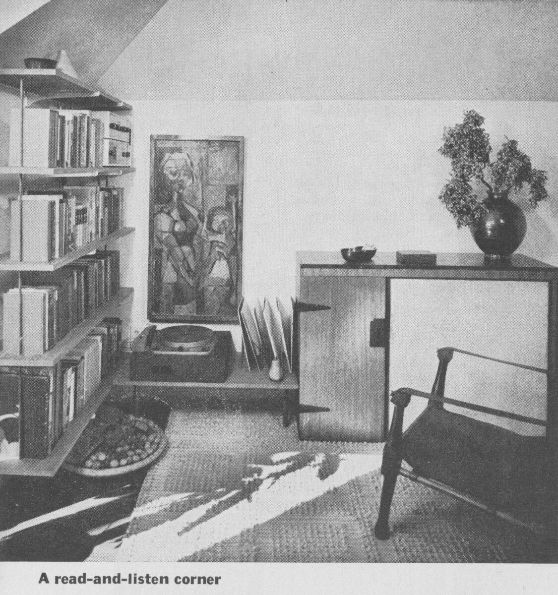 So much of what “A Guide to Bookshelves” was encouraging readers to do was not simply store their goods, but to craft a space that interacted with them, to the point that the items were integrated into the space as well. Their “read-and-listen corner” incorporated books, music, art, furniture, and decor to invite engagement with the items intentionally and spend time in a designated area that was devoted to a particular activity. As technology has progressed however, the goal seemed to be to increase portability and minimize the amount of space that a technology took up. Turntables became Walkmans and iPods, and computers shrunk until they could fit in our pockets. The contemporary revival of minimalist home decorating in the 2010s until the present day, which stems from Scandinavian and Japanese influences, also seems to directly correlate with the increase in digital daily life via smartphones and streaming. And while I believe minimalist home design is compatible with physical media, as minimalist decorating was at its peak during the 1960s and 1970s, did the decrease of physical items in people’s lives in the 2010s contribute to minimalism’s revival? This impetus to disappear physical items has increased to the point that technology is borderline invisible, with music as no longer furniture that exerts a presence in a room, but instead as imperceptible wisps in the cloud.