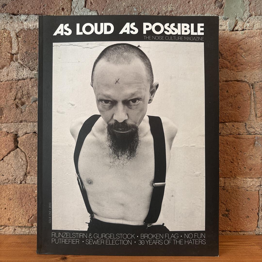 As Loud As Possible is a dense, perfect-bound UK-based magazine that debuted in late fall of 2010 to explore Noise music and culture with articles, interviews and reviews with both seminal and newly emerging sound artists that specialize in atonal sonic brutality. With ear-splitting frequencies and crumbling avalanches of layered sound, harsh noise is a provocative brand of sound art that frequently fascinates as much as it alienates. But in defence of this raging racket, I will say that Noise is one of the most conceptually rich forms of ‘music’, although it has none of the typical trappings or pretensions of music, except that it uses sound to create an emotional response. “Runzelstirn & Gurgelstock: “Artaud, Aktionkunst, Abreaction and Eb.er” : texts by Alice Kemp, accompanied by new drawings from Rudolf Eb.er, and a detailed “Aktiongraphy”. The Broken Flag Story: An extensive indepth interview with Gary Mundy, covering the career of Ramleh, the complete output of his legendary Broken Flag record label, and also featuring new interviews with the artists responsible for those releases, including: Maurizio Bianchi, Unkommuniti, Mauthausen Orchestra, Satori, Controlled Bleeding, Irritant, JFK, Mauro Teho Teardo (M.T.T.), Con-Dom Sigillum S, Agog, Giancarlo Toniutti, Vortex Campaign, Le Syndicat, Krang and many more, plus unseen artwork and photographs. No Fun: Festival curator Carlos Giffoni talk about the New York festival’s past, present and future, and covers his work with the No Fun Productions label. The Politics of HNW: The Rita’s Sam McKinlay talks about the obsessive nature of the harsh-head. Includes a list of Sam’s essential Wall Noise picks spanning the past two decades. An excellent introduction to wall-riding. 30 Years of The Haters: G.X. Jupitter – Larsen provides a personal history, as well as a delineation of his ideas, methods, and tricks accrued over three decades. The inside story from the man who has made entropy his life’s work. Putrefier: An interview with Mark Durgan, covering his twenty years in the UK’s wilderness, from Birthbiter’s heyday to the present-day. Includes reminiscences from Andy Bolus about their infamous duo project, Olympic Shit Man! Sewer Election: Sweden’s loudest, Dan Johansson talks about his music, ideas, art and running a tape label. Interview by Mikko Aspa of Grunt. Zone Nord: An album -by- album look at the discography of this retired French noise legend, including brief commentary from Mr Zone Nord himself, Jean-Luc Angles. Apraxia: An interview with Patrick Barber, the man behind the label. Covers the output of this legendary label who released Blowhole, Prick Decay, Small Cruel Party and others in the early ’90s. Cheapmachines: An interview with London sound-sculpter and all-’round sonic chameleon Phil Julian. Climax Denial: An interview with this Milwaukee-based Power Electronics lecher, including an album-by-album analysis.