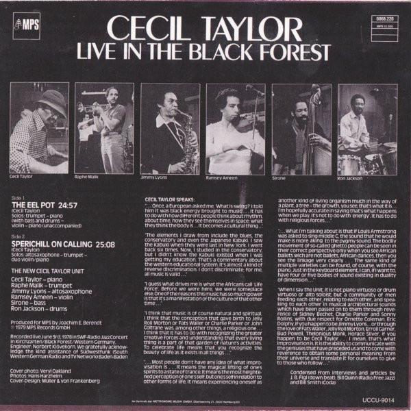 “A retrospective look at the sixty-year career of Cecil Taylor, in progress at the Whitney Museum of American Art, incorporates the museum’s unobstructed spaces and impressive views of New York City with multimedia documentation of the great composer/pianist’s sixty years of creative invention. That openness is emblematic of Taylor’s own absence of artistic boundaries. He has worked with dancers, poets, filmmakers and playwrights all while creating the most innovative avant-garde music that modern jazz has to offer. Throughout his career he has been the author of arguably the most challenging free jazz produced, some of which is incomprehensible to an average listener, but still, his music is impossible to ignore. Live in the Black Forest was originally released in 1978 on the MPS label. The live album consists of two, twenty-five minute pieces that had been recorded earlier that year for a German radio station but had never before been released in a digital format. The German label, Edel, acquired the tapes and the quality of this recording is excellent. Though they were not yet billed as such, the sextet here would later be known as the “Cecil Taylor New Unit” and included trumpeter Raphe Malik, Jimmy Lyons on alto saxophone, Ramsey Ameen on violin, bassist Sirone (Norris Jones) and drummer Ronald Shannon Jackson. This collective, however, was short lived and the earlier …”Unit,” a highly regarded version of the ensemble that appeared on Unit Structures (Blue Note, 1966), included only Lyons from this group. “The Eel Pot” is harmonically unimpeded creativeness and demonstrates why Taylor favored his long association with Lyons who immerses himself in this dynamic improvisation with the acrobatic skill necessary for a live collaboration with Taylor. Malik’s commanding, vibrato flashes are a preternatural mélange of warmth and unruliness punctuating Taylor’s snippets of melody and torrents of notes. “Sperichill On Calling” opens with a briefly melodic piano solo joined by Lyons for a bluesy into to an intense collective jam. Jackson aggressively precipitates frantically fast paced hyper-activity that briefly slows with Ameen’s searching solo. He and Taylor command the remaining ten minutes of the performance as the piece shifts in tempo, Lyons and Malik and Sirone abruptly moving in and out of focus. Even among his fan base, Taylor has been the quintessential riddle wrapped in an enigma. His music is dense and sometimes overwhelming and though Live in the Black Forest is sometimes cited as a more accessible Taylor primer, it is no less complex than the body of his work. Taylor has always had critical detractors but often for no more than the irritating inability to explain his music. Live in the Black Forest is for Taylor fans, particularly those who favor the pianist outside his preferred solo formation. Like most everything Taylor has recorded, this once hard-to-find recording requires patience and open ears.” – allaboutjazz.com