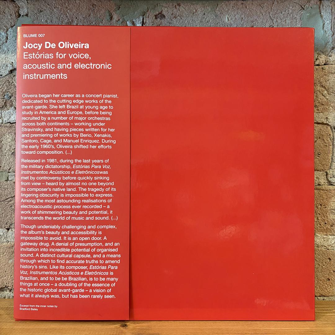 “The legendary debut of Jocy De Oliveira – and a landmark classic from the 70s Brazlian Electronic music scene. To quote Keith Fullerton Whitman, this is the “lost Tropicalia / Psych / free-Vocal / Ring-Modulator freakout / jam hybrid that you’ve only dreamt about!” It is difficult to overstate the importance of Jocy De Oliveira. Defined by a body of singular music spanning seven decades, within the histories and continuing legacies of avant-garde practice, she is without equivalent. Her work is a lens – a window into breadth, idealism, and actualities of her many eras – of all the possibilities they’ve held. While she remains a widely celebrated voice in her own country – Brazil, perhaps more than any other figure, Oliveira’s life and career, with her album Estórias Para Voz, Instrumentos Acústicos e Eletrônicos from 1981 – resonating through a shimmering body of organised sound, unveils truths lingering in the shadows – histories long suppressed and lost – the sins suffered by the Latin American avant-garde, with the actualities of its astounding heights. Oliveira began her career as a concert pianist, dedicated to the cutting edge works of the avant-garde. She left Brazil at young age to study in America and Europe, before being recruited by major orchestras across both continents – working under Stravinsky, and having pieces written for her and premiering of works by Berio, Xenakis, Santoro, Cage, and Manuel Enriquez. Her rendering of Messiaen’s Catalogue D’Oiseaux is still widely held as the definitive version. During the early 1960’s, Oliveira shifted her efforts toward composition. A wildly restless creative mind, she embarked on a process of folding organised sounds across nearly every context it could inhabit – public and private interventions, theatre, installations, film, video, tape, as much as the concert hall – blurring the lines between performance and composition, incorporating diverse media well beyond the world of sound. In 1961, within a collaborative theatre work written with Luciano Berio – Berio Apague Meu Spot Light, she instigated the first performance of electronic music staged in Brazil. In 1968 she joined Pauline Oliveros and Annea Lockwood as one of the only women asked to contribute to the legendary publication Source: Music of the Avant Garde – entering its fourth and seventh editions, and became its sole Latin American contributor. Only the beginnings of what, over the coming decades, would rise as her singular and astounding body of achievement and work. Released in 1981, during the last years of her country’s military dictatorship, Estórias Para Voz, Instrumentos Acústicos e Eletrônicos was met by controversy before quickly sinking from view – heard by almost no one beyond Brazil’s borders. Among the most astounding realisations of electroacoustic process ever recorded – a work of shimmering beauty and potential, across its two sides, Oliveira yields works which level the field. A series of sonic stories for voice, and acoustic and electronic instruments – prepared piano, violin, percussion, synthesizers, electric celesta, etc, it the album’s singularity, culture, humanity, and introspection which can not be displaced. Like its composer, Estórias Para Voz, Instrumentos Acústicos e Eletrônicos is Brazilian, and to be be Brazilian, is to be many things at once. It’s works draws on a diverse range of the country’s musics and percussion traditions, as well as Indian raga structures, and Japanese Shomyo singing – inspired in part by the sounds of immigrant communities within Sao Paulo, the city where Oliveira grew up. Across the album’s breadth, electronic music returns home – distilling the entirety of Oliveira’s being, radically diverse culture, and idealism. A work of profound democracy, optimism, and truth – reforming history, and in so doing, placing the future of the avant-garde back into its own hands. Reissued for the first time since it original release, this marks the return of one of the 20th century’s most important electronic works. Presented with the care and craft for which Blume editions has become known, these are the wonders of art – the towering heights of sounds – the realm where countless possible utopias unfold. The LP comes as a limited edition, in full color cover with a printed inner sleeve housing a Nagaoka anti-static record sleeve, Red colored vinyl and an original insert that functions as Obi as well.”