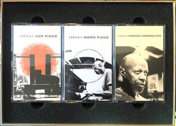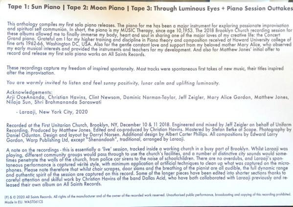 “All Saints Records present a 3 Cassette box set anthology of Laraaji’s recent piano trilogy Sun Piano, Moon Piano, and Through Luminous Eyes. The box set includes cassette versions of all three albums, plus a selection of never before heard outtakes from the recording sessions which took place over two days at the First Unitarian Church, Brooklyn, NY, December 10 & 11 2018, available exclusively as part of this box set. When asked about the release, Laraaji said “This anthology compiles my first solo piano releases. The piano for me has been a major instrument for exploring passionate improvisation and spiritual self communion. In short, the piano is my MUSIC Therapy, since age 10,1953. The 2018 Brooklyn Church recording session for these albums allowed me to finally immerse my body, heart and soul in sharing one of the major loves of my creative life: the Concert Grand piano. These recordings capture my freedom of inspired spontaneity. Most tracks were spontaneous first takes of new music, their titles inspired after the improvisation. You are warmly invited to listen and feel sunny positivity, lunar calm and uplifting luminosity.””