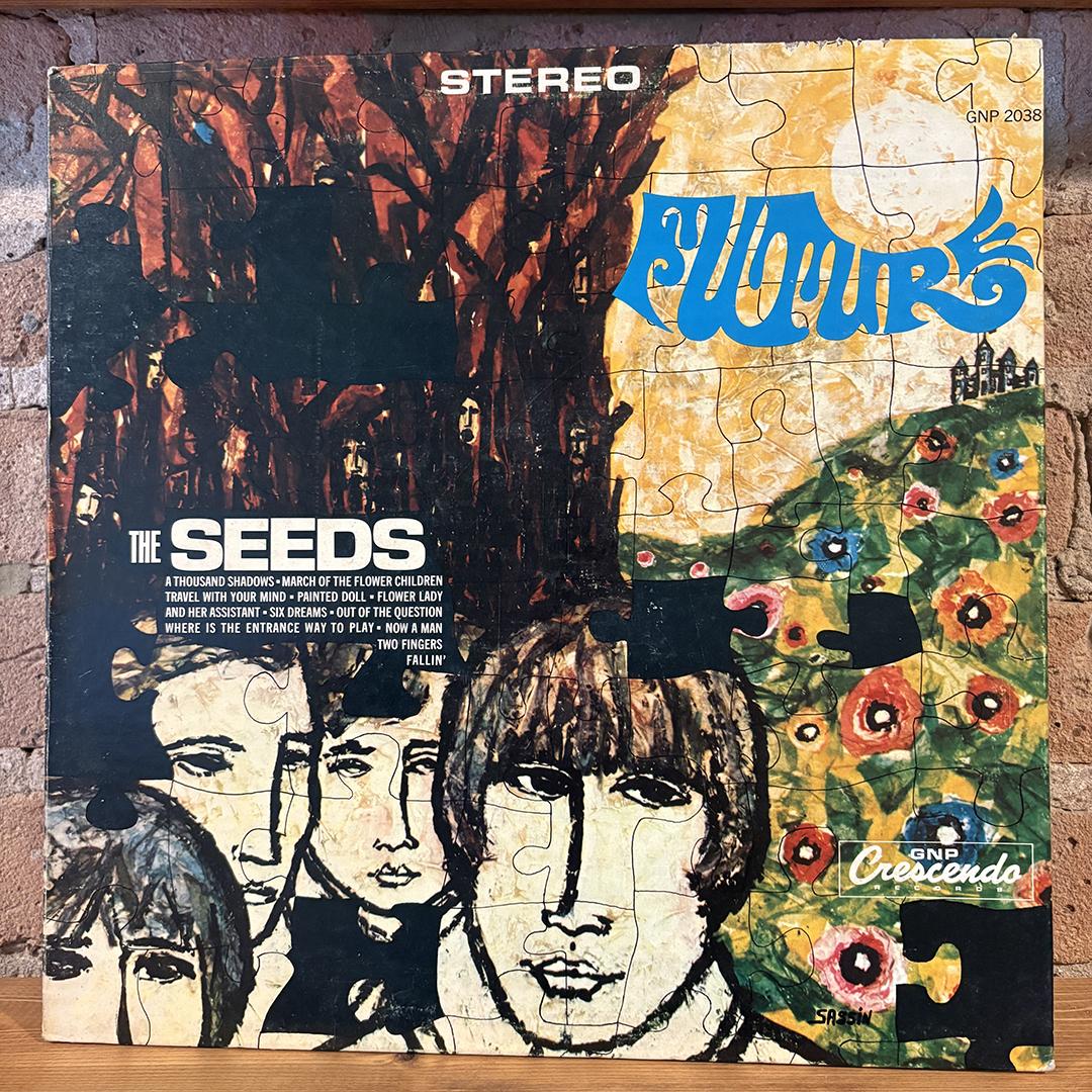 “Though the Seeds’ third album, 1967’s Future, was pegged by critics as the band’s attempt to ride the wave of baroque/psychedelic/orchestral magic the Beatles defined with Sgt. Pepper’s, the recording was actually complete before the release of the Beatles’ far more popular breakthrough album, making it impossible for the influence to touch the uncannily similarly minded flower power tones of Future. The Seeds had their own relatively huge smash with the raw high-pressure garage thumper “Pushin’ Too Hard” the year before, and saw nothing wrong with recycling that tune’s melody on more than a few songs on their first two albums. The melody and feel of that track is revisited on Future in the form of “Out of the Question” and the spooky organ of “A Thousand Shadows,” but a deliberate attempt to move away from the band’s by-the-numbers caveman garage rock toward something more experimental, spectral, and musical can be felt all over the rest of the album. While Sgt. Pepper’s set a standard for this type of conceptual, genre-bending rock, other heavyweight contemporaries of the Seeds were already experimenting with injecting their straightforward rock & roll with mind-expanding psychedelia and uncommon orchestration. Love, the Zombies, Blues Magoos, and the Left Banke were all getting into flutes, Mellotrons, and harps by 1967, and the Seeds themselves had hinted at a classical influence with the haunting piano solo of their earlier classic “Can’t Seem to Make You Mine.” Though Future sought to expand on the raw approach of earlier albums with heightened musicality, there’s no real concept to tie the various pieces together. Instead, listeners were treated to a pleasant if confusing mishmash of attempted statements. There are stabs at mind-expanding psychedelic mantras like the spare raga-esque guitars and muddy bongos of “Travel with Your Mind,” indulgent string sections and random-sounding harpsichords on “Painted Doll” and the waltzy, tuba-heavy “Two Fingers Pointing on You,” the aforementioned garage vamps, and all of the above on the obligatory seven-minute album-closing jam “Fallin’.” While it’s clear vocalist Sky Saxon and company were tuned into the electricity and open-mindedness of the burgeoning hippie movement, the various experiments on Future fail to ever congeal. Even in the most orchestrated, quiet, or overwrought moments, the Seeds can’t quite shake their core personalities, sounding less like they’re changing directions and more like they’re donning a new costume with each song, never really settling on one look before just leaving in the clothes they were wearing to begin with. While the sidesteps into Technicolor psychedelia and overly serious orchestration are interesting and sometimes good, nothing has quite the same power as Saxon’s feral howls or the burning fuzz guitar that escapes in the least calculated (and most exciting) moments of Future.” – allmusic.com